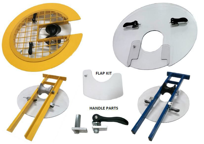 * Attaches to each ASPC safety manhole cover manhole roller* Helps protect the user from exposure to a sewer’ environmental elements* Fits most industry standard grated manhole covers (21.38” O.D.)* Quick release handles for easy, efficient effective application* Made of .236 polycarbonate for lasting durability* Additional “Splash Guard Flap” and other replacement parts sold separately* WARNING: DO NOT STEP or STAND!! (when in manhole roller use) For more product options, please see our Parts List Sheet.